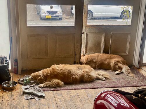マーニの散歩訓練。 まぁギリギリでもパルクまで歩いて通勤できます。 休み休みで大変ですが続けましょう。 土曜日だからクーちゃんがきたよ。 ジーナは大喜びです。 いつも通り仲良く喧嘩して走り回ってます。今年初だった! 犬の遊び場と化した店の隅でこ…