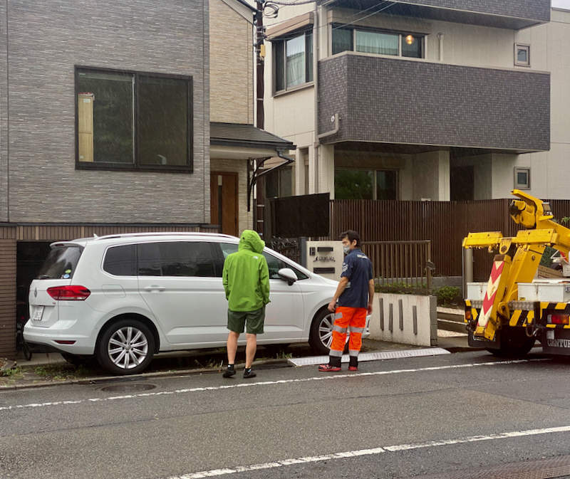 パルクの前のお家の新しいワーゲンがエンジンかからないって。